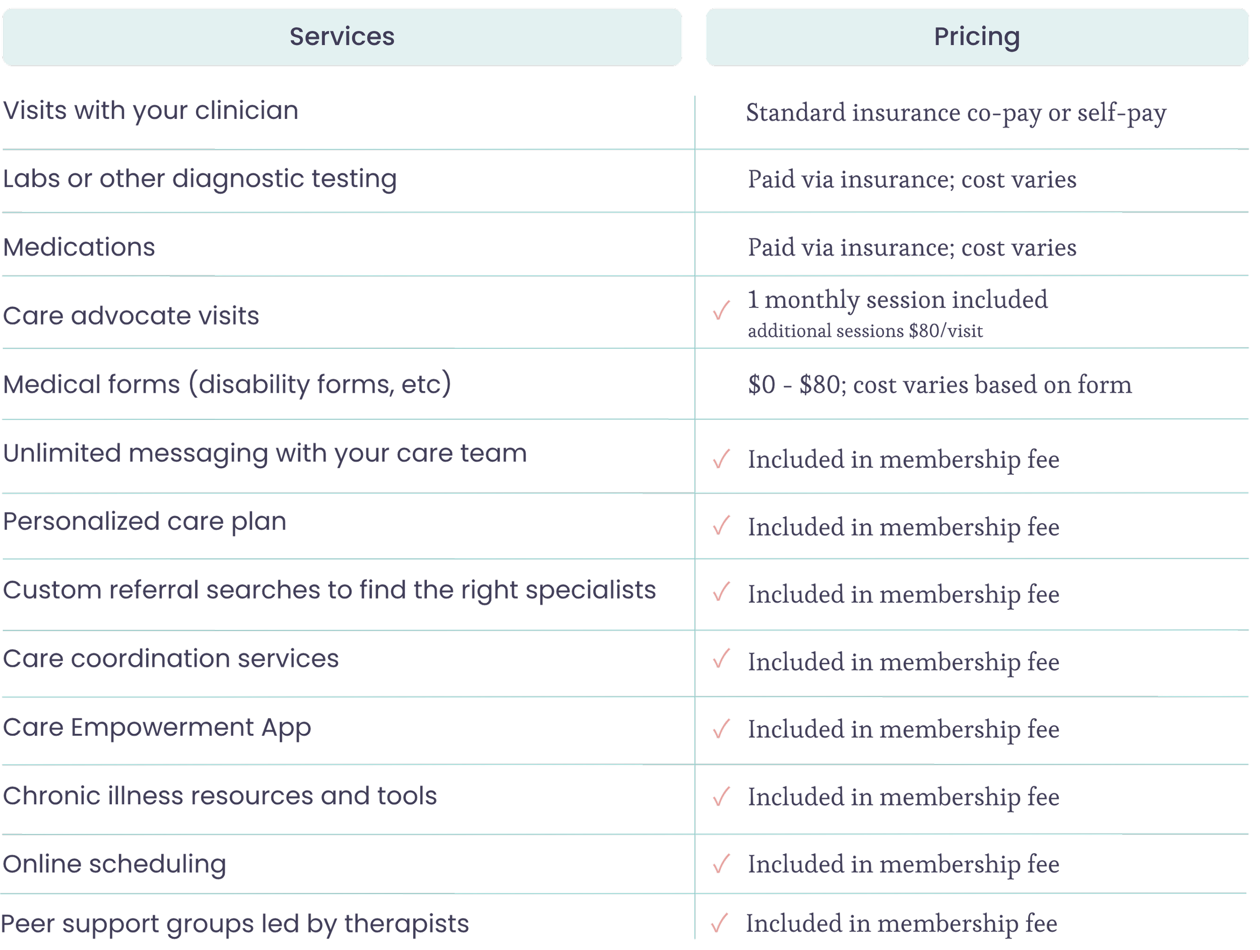We believe in transparent pricing, so you never face surprise medical bills. As a member, you only pay for visits, medications, and labs when you need them. Some costs below are not included in your monthly membership fee. Learn more about visit pricing and insurance coverage.